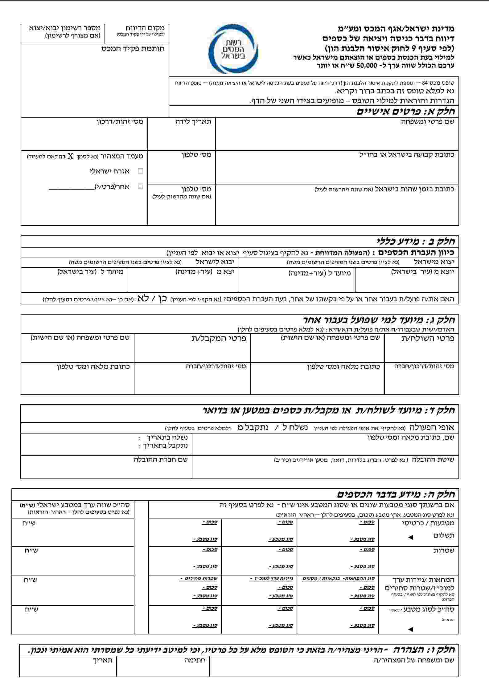 טופס דוגמה לדיווח על הכנסת כספים לישראל או הוצאת כספים מישראל